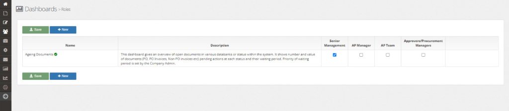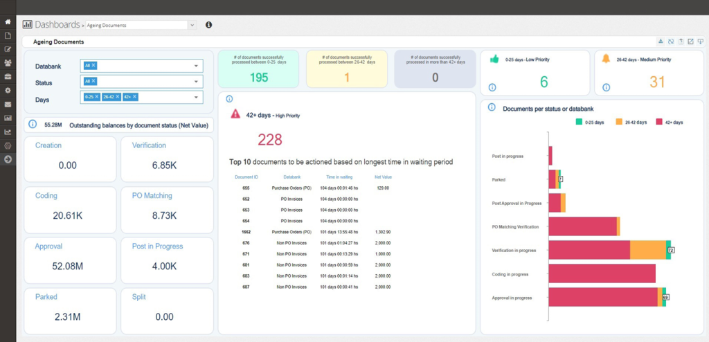 The Ageing Dashboard gives an overview of open documents received within the chosen period in various databanks or statuses within the system. It shows the number and value of each document, (PO, PO Invoices, Non-PO invoices, etc.), pending actions at each status, and their waiting period. Priority of waiting period is set by the Company Admin.