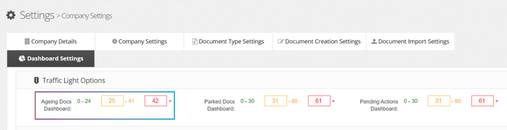 Company Admin can set the waiting/ageing period of documents that will be considered as the Green, Amber, or Red zone within the Ageing Dashboard.